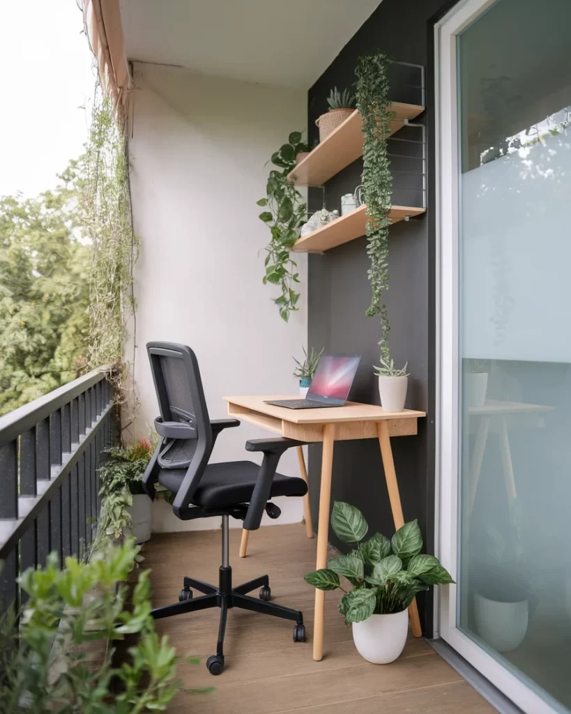 Make remote work enjoyable by transforming your balcony into a compact home office. This setup features a sleek wooden desk paired with a mesh ergonomic chair, surrounded by greenery for a refreshing backdrop. Open shelving displays trailing plants and essentials, while sunlight pours through the glass door, energizing the space. The flooring’s wood tones complement the black and white contrast on the walls, giving the area a professional yet calming look. Practical and inspiring, this design is a great way to escape indoor monotony. Choose lightweight, weather-resistant furniture and secure shelves properly for safety. Incorporate plant varieties like pothos or succulents that thrive in indirect sunlight to complete the setup.