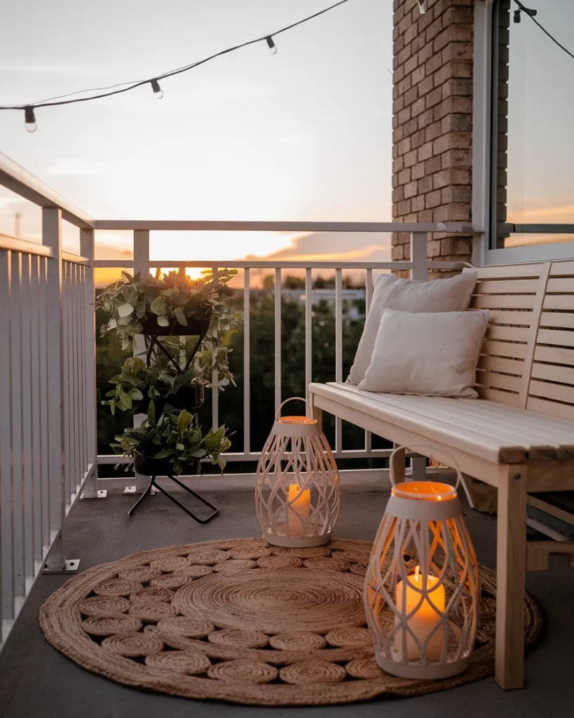 Warm Sunset Balcony with Wooden Bench, Jute Rug, and Soft Candle Lantern Glow