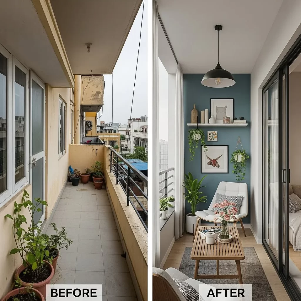 Revive your unused balcony into a chic and functional lounge using clean design elements, cozy textures, and space-saving furniture. In the “before,” a narrow corridor with chipped paint and random pots lacks charm. The “after” reveals how thoughtful design transforms the same area into a peaceful sanctuary. Start with a bold accent wall muted blue adds depth without overwhelming. Add wall shelves with curated decor and hanging planters to bring life and personality. A sleek lounge chair and a slatted wooden table offer both comfort and purpose, perfect for your morning coffee or evening book sessions. Light wood flooring, pendant lighting, and sheer curtains soften the look, making it feel like an indoor extension. This transformation proves small balconies can become practical, stylish havens.