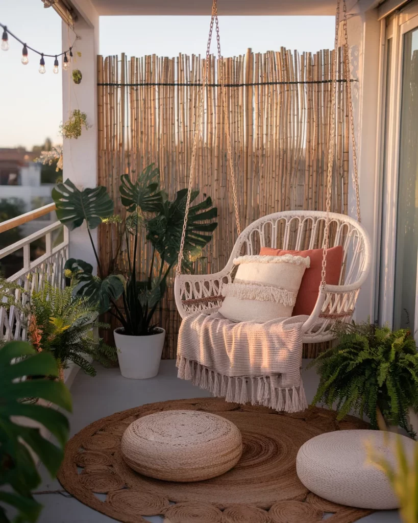 Create a cozy retreat right outside your door with this boho-style balcony featuring a woven swing chair, macrame pillows, and jute accents. As you sink into the textured cushions with a warm drink in hand, you’re wrapped in soft throws and natural serenity. The bamboo privacy screen paired with overflowing potted ferns and monstera plants adds lush greenery, making the space feel both secluded and open. Layered rugs underfoot enhance the comfort, while string lights cast a soft, ambient glow during the evening. This balcony decor is great for small apartments craving a tranquil corner. Use natural fiber seating, textured fabrics, and leafy indoor-outdoor plants to create your own bohemian haven that soothes the senses and offers visual calm.