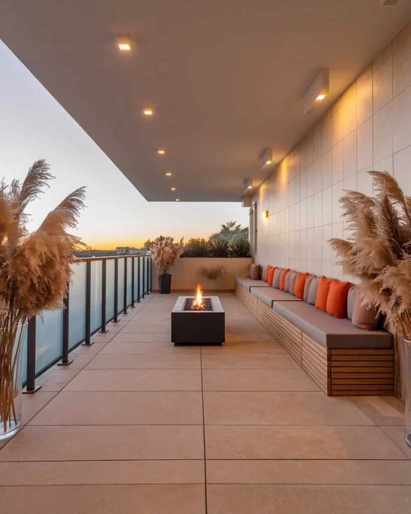 Bring luxurious comfort to your balcony with a built-in seating lounge and a sleek linear fire feature. The clean lines of the cushioned bench, paired with earthy orange and taupe tones, evoke desert calm while staying incredibly inviting. Tall pampas grass in sculptural planters adds softness and vertical interest. This setup suits larger balconies and is great for entertaining guests or relaxing under ambient lighting. Consider built-in wooden seating with storage underneath, and use LED-lit fire pits for a warm, focal point without heavy maintenance. The large porcelain tiles create a unified base, easy to clean and sophisticated in texture. You’ll enjoy this space most as twilight sets in, with the fire casting a gentle flicker.