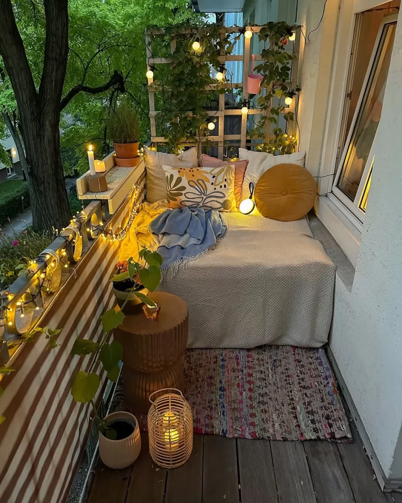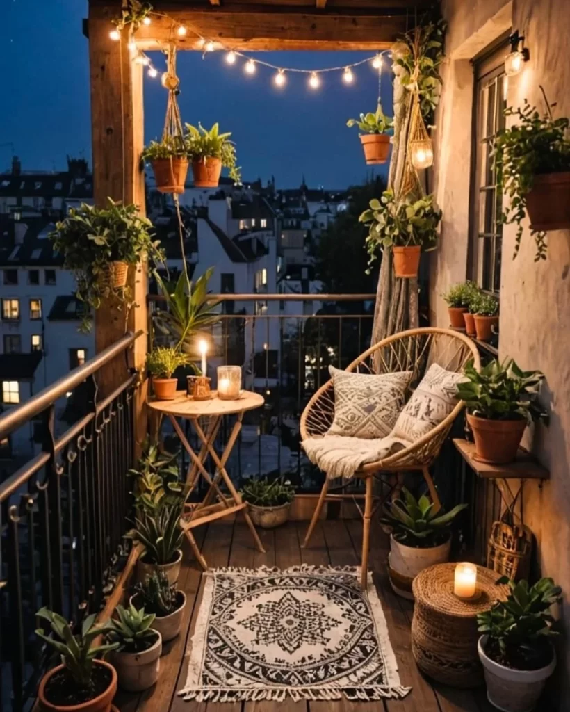 Cozy Balcony Decor with Warm Lighting and Boho-Inspired Accents for Small Urban Spaces
