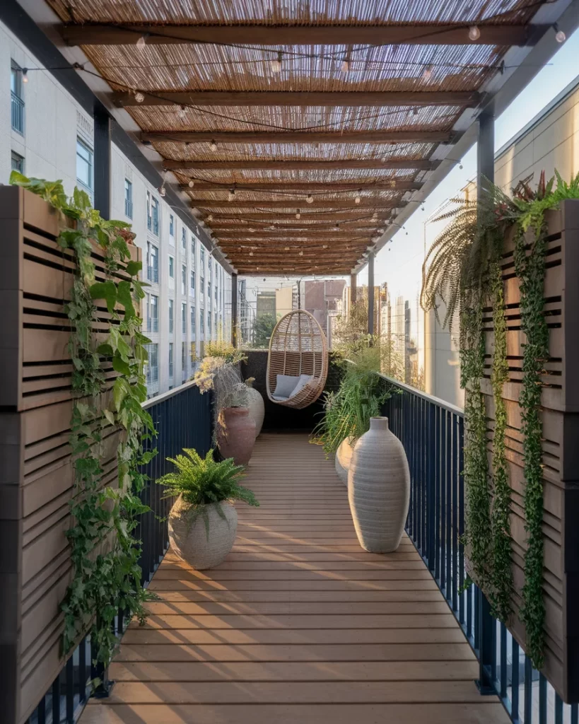 This extended balcony proves that narrow spaces can be full of charm and function. A wooden pergola casts striped shadows across the deck, creating a soft interplay of light and shade. Lush planters in earthen pots flank the walkway, while a hanging egg chair at the far end invites relaxation. The wooden flooring and rattan detailing offer a natural tone that balances beautifully with the structured black railings. String lights overhead lend a magical glow during dusk, turning this balcony into a serene escape. Perfect for evening unwinding or quiet reading time, this layout uses repetition in plant placement and earthy textures for unity. You can recreate this vibe with bamboo shades, modular seating, and curated planters.