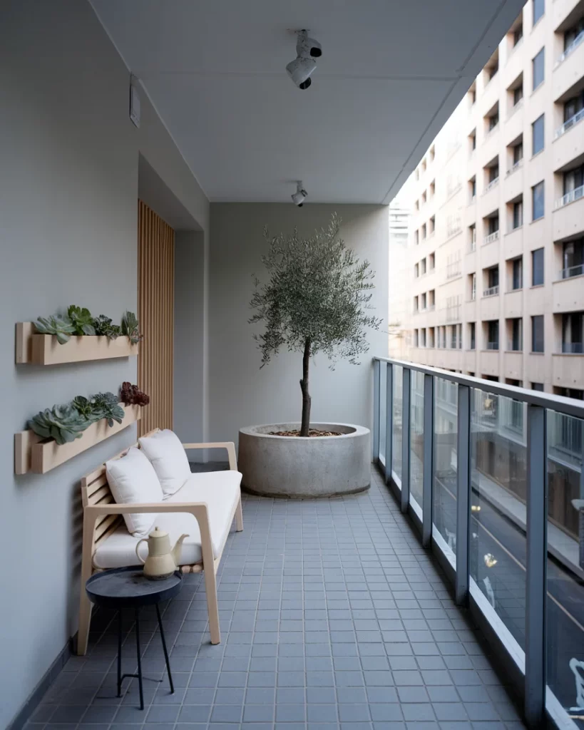 Elevate your apartment balcony with a minimalist design rooted in Scandinavian principles. The soft grey tiles underfoot create a cool foundation, while the natural wood bench with cream cushions invites calm reflection. A potted olive tree stands tall at the far end, adding Mediterranean charm and a sculptural silhouette. Mounted wooden planters with succulents enhance vertical space without overcrowding. You can recreate this sleek look by choosing neutral colors, clean-lined furniture, and a mix of evergreen and drought-tolerant plants. This balcony style is functional yet restful—perfect for quiet tea breaks or light evening reads. If you value uncluttered living and natural materials, this is a design that brings serenity and timelessness to your outdoor space.