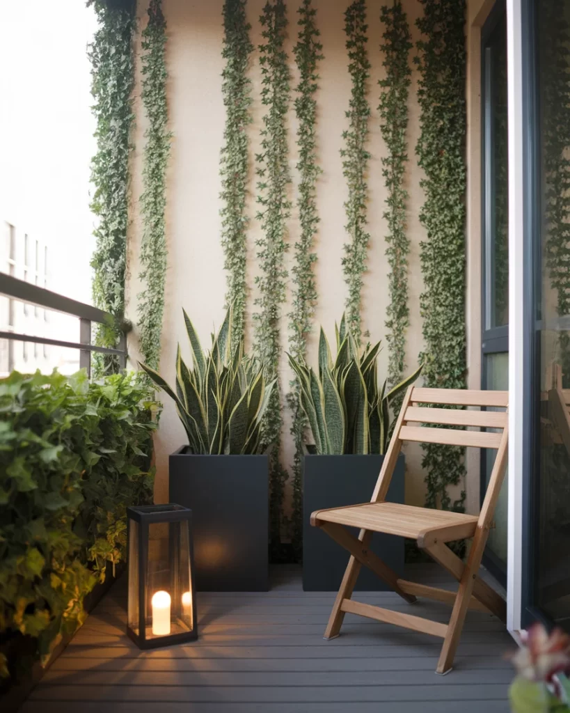 Transform tight city balconies with a clean, vertical design that brings life without clutter. This space makes clever use of height through wall-mounted vertical planters and trailing ivy vines, while two tall snake plants in matte black pots ground the area with structure. The wooden folding chair adds warmth and functionality, giving you a peaceful spot for reflection or evening tea. A lantern-style candle holder introduces cozy lighting without overwhelming the space. The neutral palette and sleek lines suit urban aesthetics, and the artificial green wall can be replicated with budget-friendly hanging panels or creeper plants. This setup is low-maintenance, especially suitable for renters or busy professionals wanting greenery without daily upkeep.