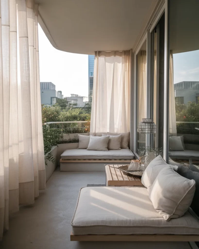 Elegant Minimal Balcony Makeover with Floor Seating, Soft Neutrals, and Sheer Curtains