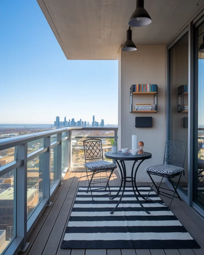Turn your high-rise balcony into a breezy city café using weather-resistant furniture and bold pattern accents. Here, a black metal bistro set sits atop a striped outdoor rug, anchoring the space with graphic appeal. Plush seat cushions in monochrome prints offer cozy seating for morning coffee or evening wine. The compact bookshelf adds functionality, letting you store reads and décor right on the wall. Whether you’re enjoying a solo sunset or hosting a quick chat over espresso, this setup feels welcoming and stylish. Choose powder-coated iron for durability, and combine it with soft fabrics for balance. The open glass railing keeps the skyline in full view, blending urban energy with personal comfort.