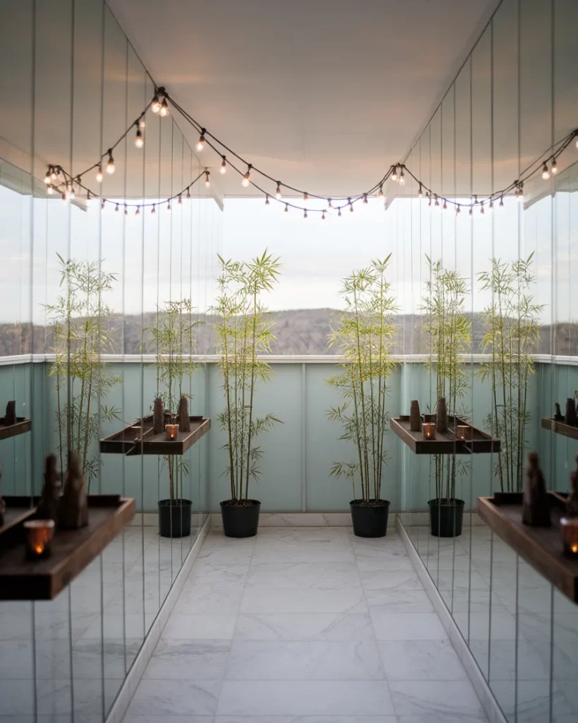 Modern Balcony Spa Design with Bamboo Privacy Screen and String Lighting
