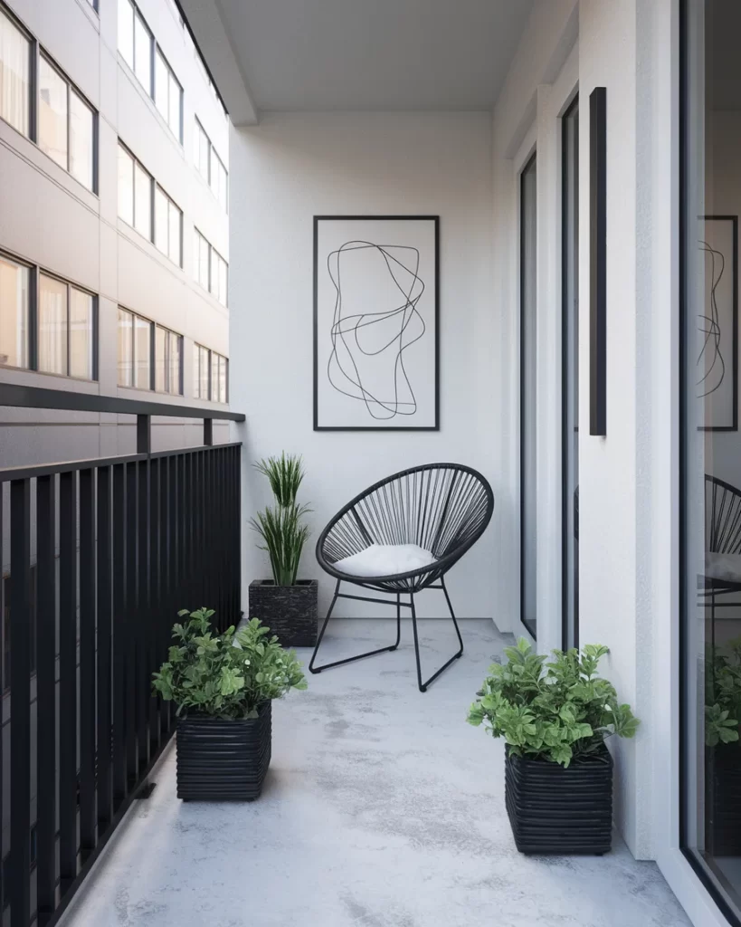 If you’re drawn to clean lines and urban edge, this modern minimalist balcony design is tailored for you. A black wired accent chair with a soft white faux fur pad anchors the space without overwhelming it, creating a simple yet inviting seat for quiet coffee breaks. The concrete floor keeps the look grounded, while sleek rectangular planters in matte black add a touch of greenery without interrupting the palette. A single abstract line art piece adds interest to the white walls, echoing the balance between form and function. This look is all about restraint and contrast use monochrome tones, minimal furniture, and geometric planters to make your small apartment balcony feel larger, calmer, and stylish with very little effort.