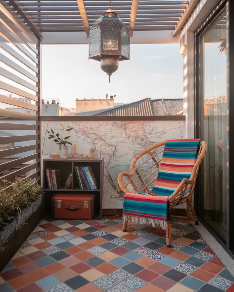 Moroccan style terrace with patterned tiles, brass lantern, rattan chair, and world map backdrop