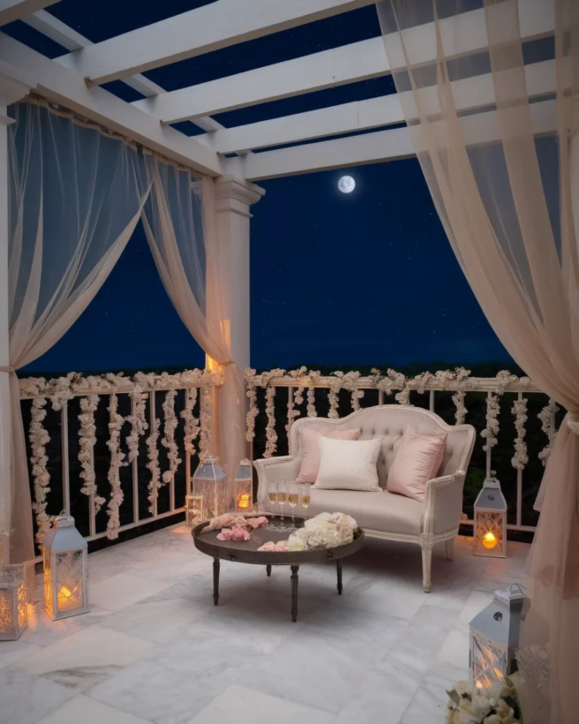 Design an enchanting outdoor retreat using flowing white curtains that create intimate privacy while allowing gentle breezes to circulate freely. You’ll appreciate how the structured pergola framework provides stability for the fabric panels while maintaining an elegant, resort like atmosphere under starlit skies. The abundant white floral garlands draped along the railing transform your balcony into a romantic sanctuary reminiscent of luxury hotel terraces. When recreating this look, choose artificial flowers that maintain their appearance through various weather conditions, or plan for regular fresh flower replacements during special occasions.