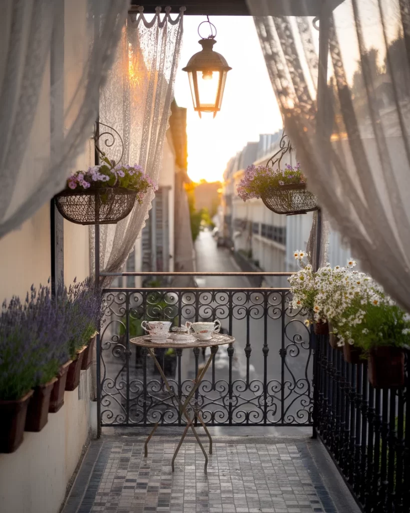 Step into an old-world escape with this romantic wrought iron balcony adorned in vintage details and flower-draped railings. The mosaic-tiled floor cools under your feet as sheer white curtains flutter in the breeze. Hanging baskets overflow with lavender and daisies, creating a sensory-rich environment filled with color and fragrance. The dainty round table, set for tea, beckons for slow moments and heartfelt conversations. You can bring this ambiance home by combining metal railings, distressed furnishings, and soft, floral textiles. Try installing curtain rods across your balcony for light linen panels and mix container herbs like rosemary or thyme for both scent and function. This setup is best enjoyed during golden hour with a warm drink in hand.