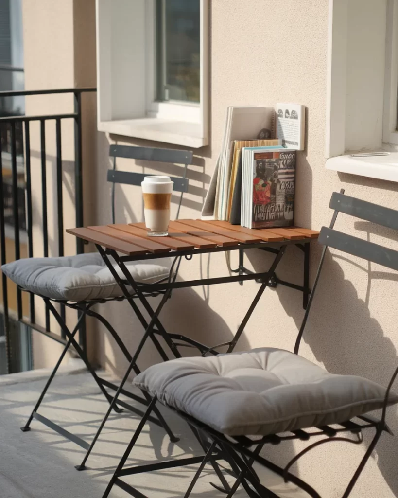 Turn your balcony into a morning ritual zone with this Scandinavian-inspired coffee nook. Featuring a compact wooden table and metal chairs with tufted cushions, this design balances comfort and style. The soft sunlight streaming across the setup warms your coffee while you flip through magazines stored neatly in a mounted holder. The use of neutral tones and practical furniture offers a clutter-free environment that encourages calm starts. This look is easy to achieve with folding bistro sets, weather-resistant cushions, and minimal décor. Whether you’re working remotely or savoring a quiet moment, this nook becomes a daily destination. Add a potted herb or flower box nearby to layer in freshness and scent.
