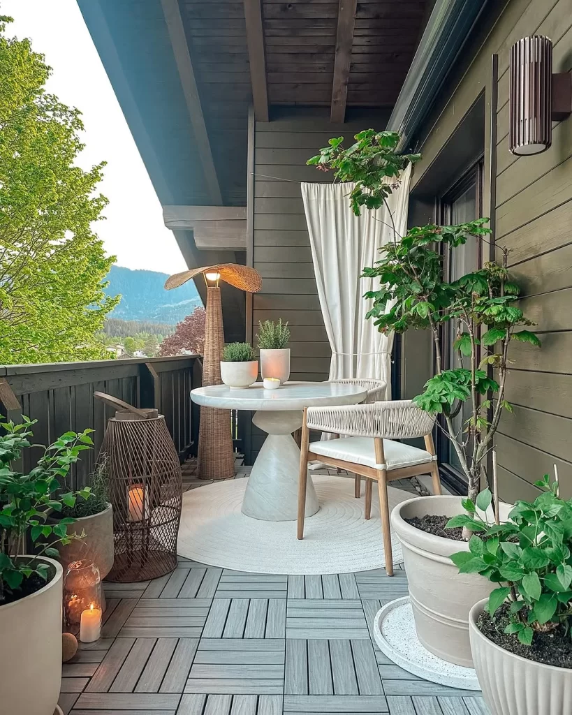 Create a serene and stylish retreat on your balcony with this Scandinavian-inspired design that blends earthy elegance with cozy functionality. Pale wood deck tiles lay the foundation, offering a clean and breathable surface that pairs beautifully with the surrounding greenery. The round concrete table anchors the space, inviting quiet breakfasts or evening wine moments. Rope-woven chairs add an artisanal touch while remaining light and functional. A neutral area rug and gauzy curtain bring softness, creating an indoor-outdoor transition. Soft candlelight flickers through woven lanterns, adding warmth and intimacy to your setting. With tall potted plants strategically placed for privacy and visual layering, this balcony becomes more than just a nook, it becomes your go-to relaxation corner with minimal maintenance and maximum charm.