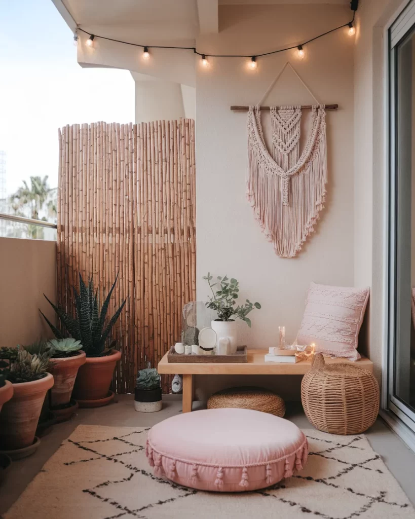 Embrace relaxed comfort with this boho-style balcony that turns even the smallest space into a peaceful nook for slow mornings and quiet evenings. Picture the feeling of sinking into a blush pink floor cushion, surrounded by terracotta potted succulents and candlelight dancing off the walls. The bamboo screen provides natural texture and privacy, while string lights above add a soft golden glow at twilight. A simple wooden bench acts as both a table and a low seat, complemented by a round wicker pouf and plush embroidered pillow. The macramé wall hanging enhances the earthy vibe, grounding the space with artisanal charm. This setup is easy to recreate just focus on layered textures, warm tones, and a mix of organic materials.