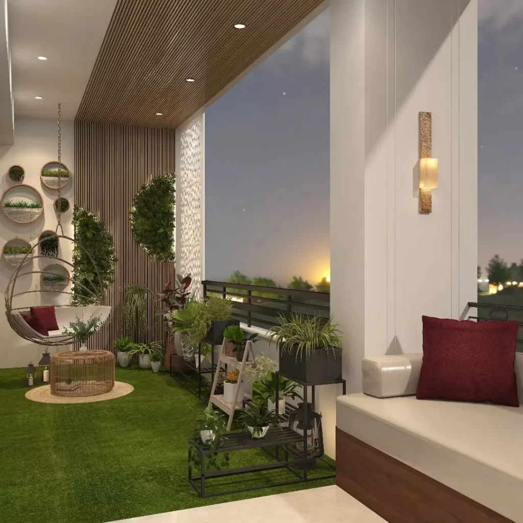Elevate your balcony into a luxurious escape by blending nature-inspired design with modern comfort. This thoughtfully curated space features lush artificial grass flooring that instantly adds warmth and a barefoot-friendly texture underfoot. To the left, a statement hanging chair offers a dreamy spot to unwind, paired with plush cushions and a circular jute rug for a grounded aesthetic. The vertical wooden slats double as a design feature and a support for a stunning wall garden, with planters in geometric shapes adding dimension. Metal plant stands and shelves maximize greenery without overwhelming floor space. Soft ambient lighting and a built-in bench with accent pillows create an inviting nook. This layout proves that even open balconies can feel like stylish indoor sanctuaries when designed with balance and intention.