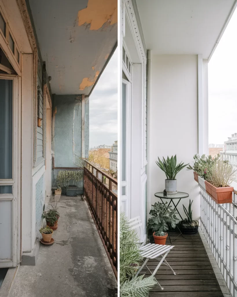 See the striking transformation of a once-neglected balcony into a stylish and functional outdoor nook. On the left, the peeling paint, rusted metal railings, and scattered potted plants reflect years of wear. But on the right, a fresh coat of paint and crisp white railings bring life back into the space. Wooden flooring adds warmth underfoot, instantly making it feel more inviting. A compact table and chair set now sit in the corner, offering a cozy spot for sipping your morning coffee or enjoying the city skyline. This makeover shows that with thoughtful upgrades like updated flooring, coordinated planters, and basic furniture you can turn even the most weathered balcony into a calming urban oasis.