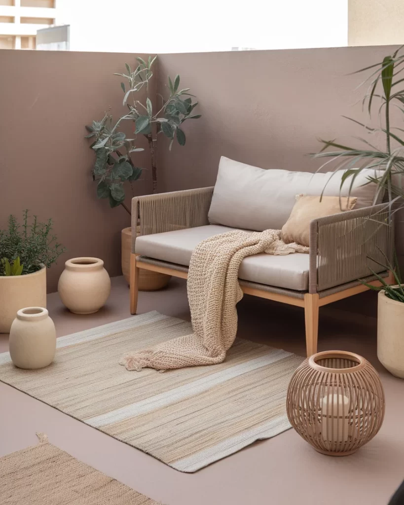 Bring calm into your outdoor routine with this cozy, neutral-toned balcony makeover. A compact sofa in light taupe provides comfortable seating, draped with a chunky knit throw for texture and warmth. The blush-mauve walls and clay-toned planters ground the space with organic simplicity, while leafy greenery adds soft contrast. A striped woven rug stretches underfoot, balancing the warm tones and creating a subtle focal point. Decorative clay jars and a rattan lantern introduce artisanal charm and a gentle glow when the sun sets. This look is all about embracing subtle earthy palettes try layering beige, sand, and soft terracotta. It’s the kind of balcony that invites slow mornings with coffee, quiet reading, and soft candlelight in the evening.