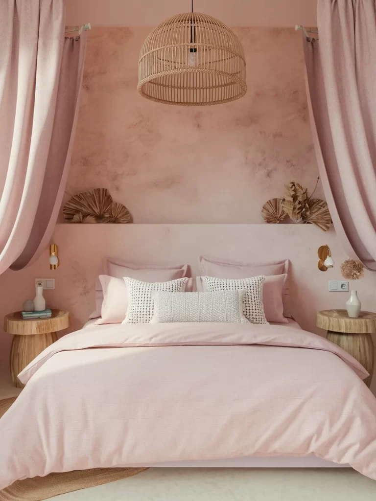 A dreamy adult bedroom featuring soft pink walls and coordinating bedding. The natural wicker pendant light and dried palm fronds create tropical vibes, while the built-in bed nook with flowing curtains adds drama and intimacy to the space.
