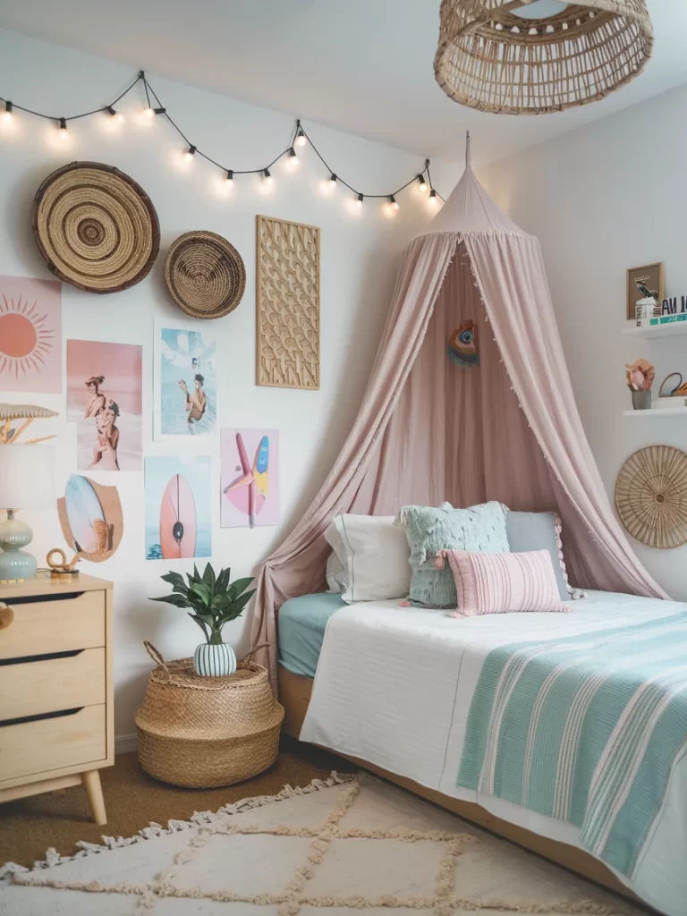A more colorful interpretation featuring a gallery wall of beach photography, woven baskets, and a dramatic bed canopy. The mint green and pink accents create a fresh, youthful energy.