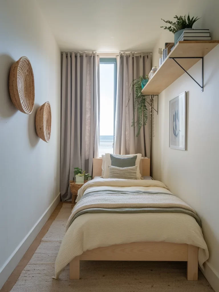 This smaller bedroom maximizes space while maintaining coastal boho style through clever design choices. The room features woven circular wall art in varying sizes, creating visual interest without overwhelming the compact space. A simple wooden bed frame is dressed in layered neutral bedding with sage green accents that complement the coastal theme. Floating shelves provide vertical storage for books and plants, including trailing greenery that adds life to the space. The large window offers what appears to be an ocean view, perfectly complementing the coastal aesthetic, while gray curtains and a jute rug ground the neutral palette.