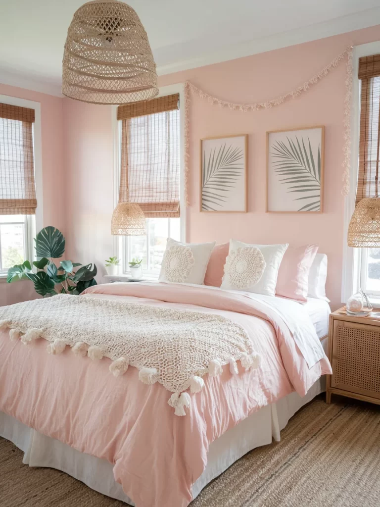 This ultra-feminine bedroom uses blush pink as the dominant color, paired with natural textures like bamboo blinds and palm prints. The crocheted throw and tasseled garland add handmade boho touches.