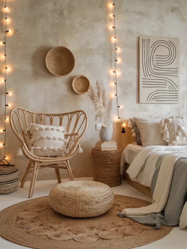 This room showcases maximum texture with string lights, woven baskets as wall art, a rattan peacock chair, and layered rugs. The neutral color palette allows the various textures to shine, creating a cozy reading nook alongside the bed.
