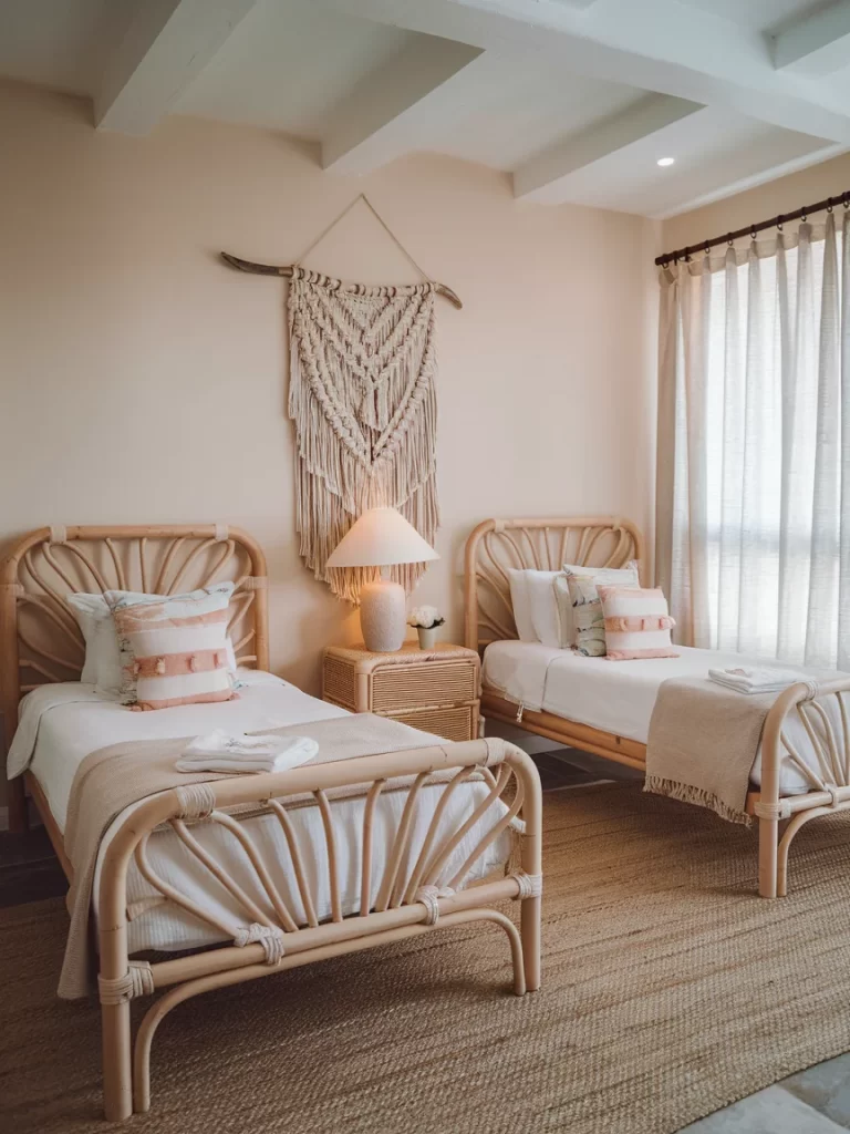 This sophisticated shared bedroom features two matching rattan beds with elegant curved headboards and footboards that evoke a tropical resort aesthetic. The room is anchored by a stunning large-scale macramé wall hanging suspended from a piece of driftwood, creating a dramatic focal point. White exposed ceiling beams add architectural interest, while the neutral color scheme of whites, creams, and natural wood creates a serene atmosphere. Soft pink accent pillows and throws add subtle warmth, and the woven rattan nightstand between the beds provides practical storage while maintaining the natural materials theme.