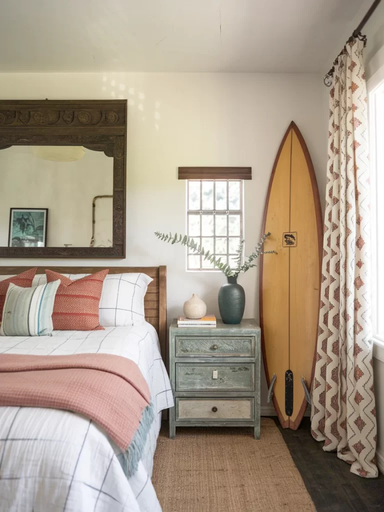 A more masculine take on coastal boho, featuring vintage surf decor and weathered wood elements. The surfboard adds authentic beach culture vibes, while traditional textiles and warm colors keep it grounded.