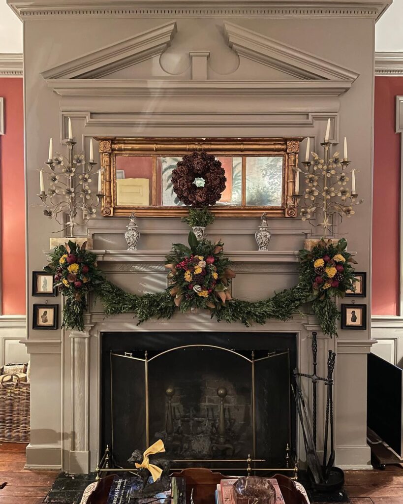 This mantel displays a more subdued palette with a dark wreath centerpiece surrounded by ornate candelabras. The garland incorporates warm autumn colors – burgundy, gold, and orange flowers – making it perfect for extending holiday decor from Thanksgiving through Christmas. The formal mirror and elegant styling suggest a more refined decorating approach.