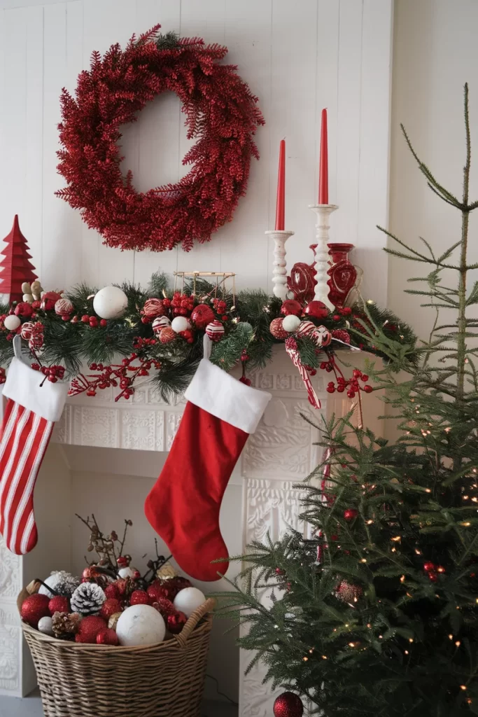 This dramatic mantel features a vibrant red fern or cedar wreath paired with matching red candles and white candlesticks. The garland includes red and white ornaments with red berries, creating a monochromatic red theme that’s both bold and sophisticated.
