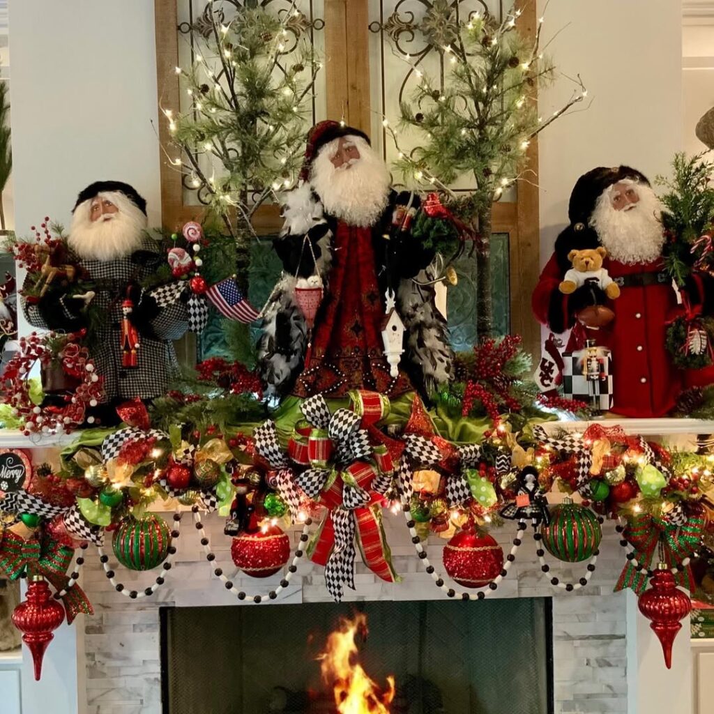 Three large Santa figures in different outfits create a dramatic focal point on this mantel, surrounded by rich garland with red and black accents. Ornamental teardrops hang below while the color scheme emphasizes traditional reds, greens, and blacks. This design makes a bold statement about the magic and joy of the Christmas season.