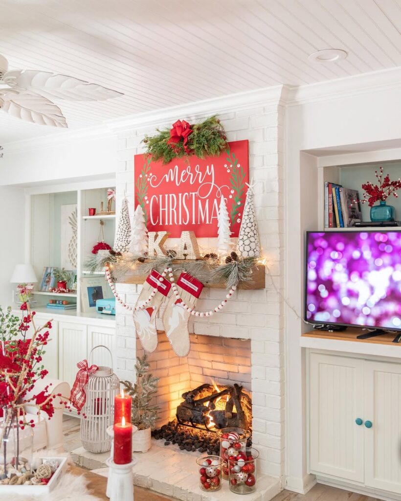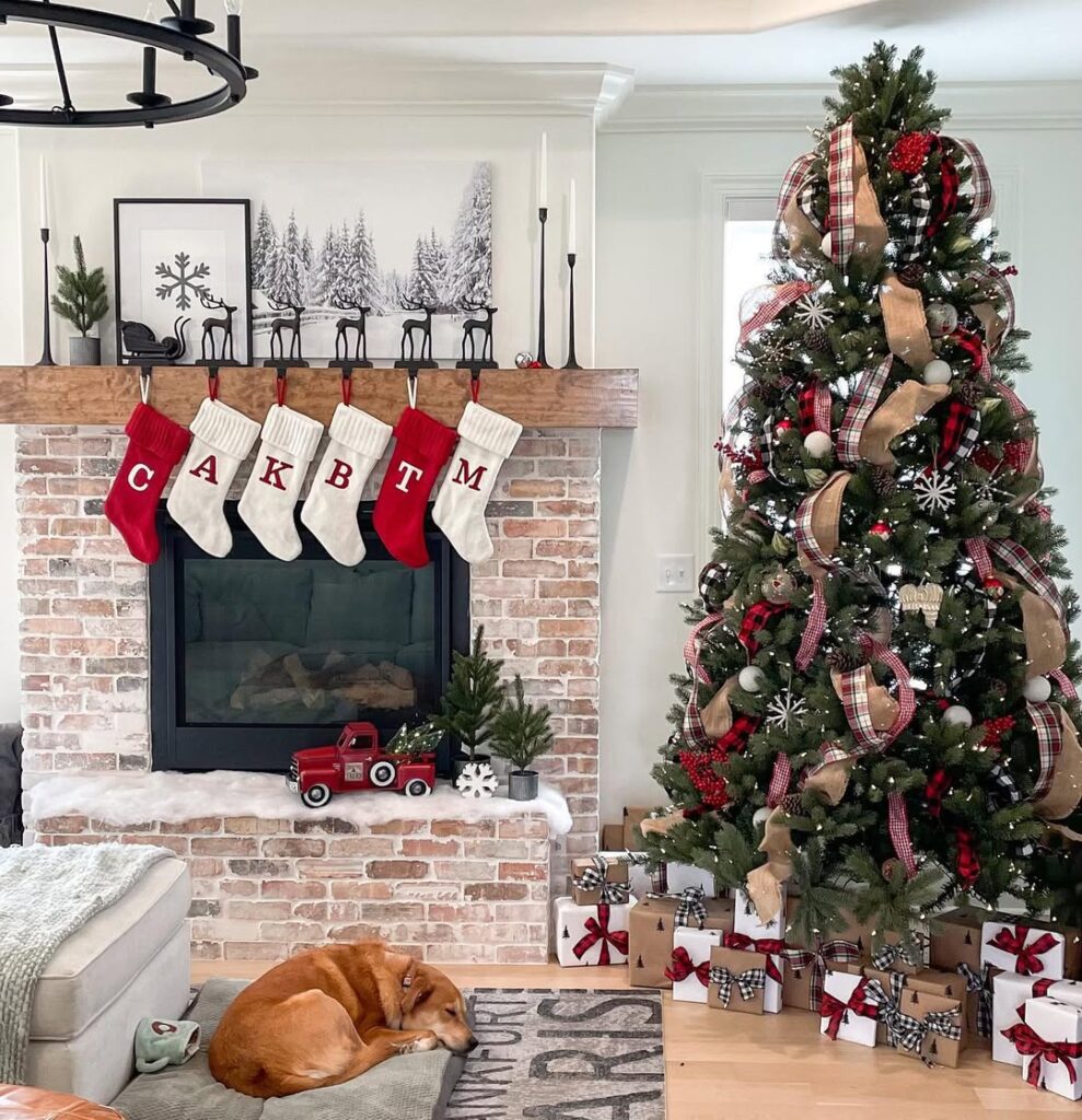 Red and white stockings spell out “C-A-K-B-T-M” along this brick fireplace, while a fully decorated Christmas tree stands nearby with plaid and burlap ribbon. The rustic charm comes from the combination of traditional red elements with natural textures and a winter forest scene artwork above.