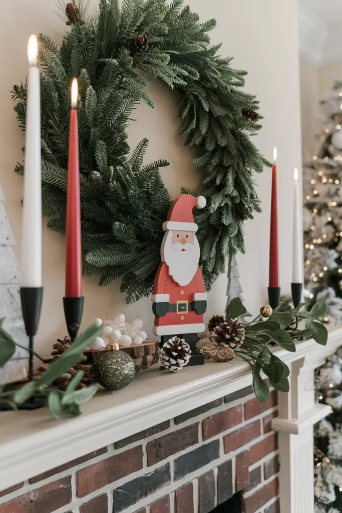 This mantel features a lush evergreen wreath as the centerpiece, flanked by tall red and white taper candles in elegant holders. A charming wooden Santa figure takes center stage, surrounded by natural elements like pinecones, eucalyptus greenery, and a decorative ornament. The brick fireplace backdrop adds warmth and rustic charm.