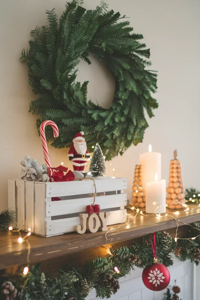 A simple evergreen wreath with a red velvet bow hangs above a white wooden crate filled with holiday treasures including a Santa figure, small Christmas tree, candy canes, and “JOY” wooden letters. String lights and candles add warmth to this charming country-style display.