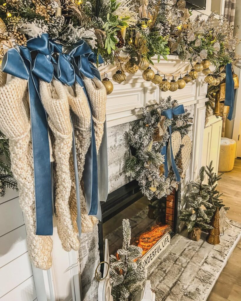 This sophisticated setup features cream knit stockings with dusty blue velvet ribbons hanging from a white mantel. The garland includes gold ornaments and natural greenery, creating an upscale winter wonderland effect. A decorative sleigh and evergreen arrangements complete the refined look.