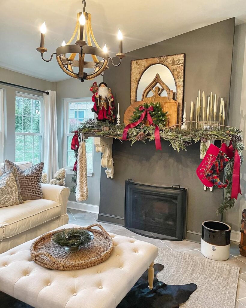 This mantel combines rustic and refined elements with a gray color scheme. Natural wood cutting boards, brass candlesticks, and a traditional Santa figure create visual interest. The red ribbon accents provide the primary Christmas color against the otherwise neutral palette, demonstrating how to incorporate holiday spirit in modern farmhouse decor.