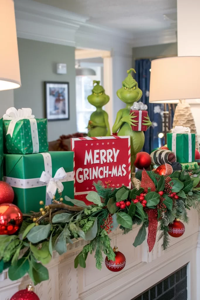 A creative twist on traditional Christmas decor, this mantel features Grinch figurines among wrapped presents in green and red. A “Merry Grinch-mas” sign adds humor, while the evergreen garland with red ornaments maintains the festive spirit with a playful character theme.