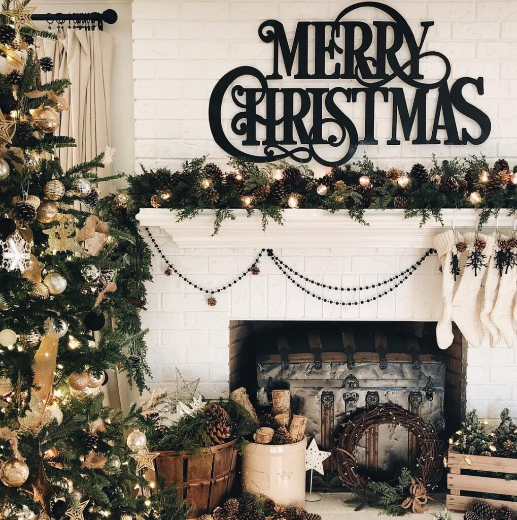 This refined design uses a bold “MERRY CHRISTMAS” metal sign as the focal point, complemented by natural greenery with pinecones and warm lighting. The neutral color palette focuses on whites, creams, and natural greens, while white stockings maintain the clean, sophisticated aesthetic. The approach proves that simple elements can create powerful visual impact.