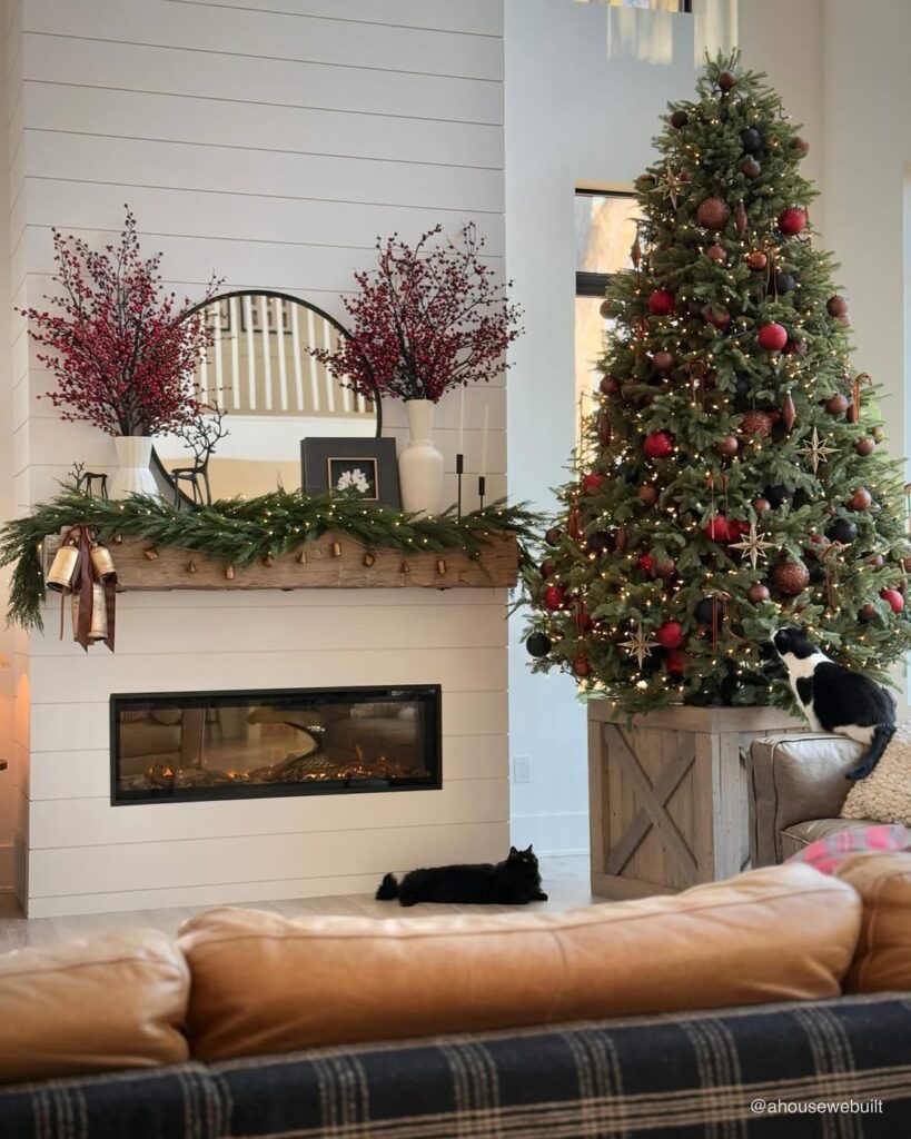 This contemporary approach features a clean white shiplap wall with a modern linear fireplace. The mantel decoration is understated, using simple greenery and minimal ornaments. A large Christmas tree in a wooden box planter serves as the main focal point, showing how holiday decor can work in modern spaces without overwhelming the architecture.