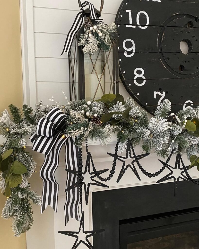 This black and white themed display uses striped ribbon accents and flocked greenery for a sophisticated winter look. A large clock serves as the backdrop, while a metal lantern and beaded garland create texture. The monochromatic palette offers a modern twist on traditional Christmas decorating.