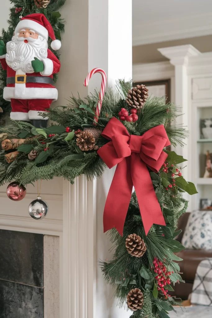 This mantel combines multiple textures with evergreen garland, pinecones, wooden elements, and a “Happy Holidays” wooden sign. Red and white striped ribbon adds a candy cane element, while white paper snowflakes and small wooden trees create a winter forest scene.