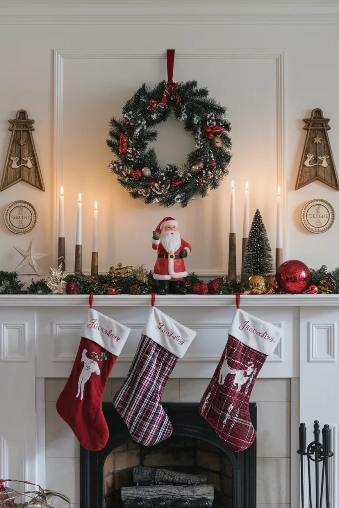 Three personalized plaid stockings hang from a white mantel, each featuring different patterns and name embroidery. Above, a decorated wreath with mixed ornaments and greenery creates a formal yet family-friendly holiday display with traditional wooden decorative elements.