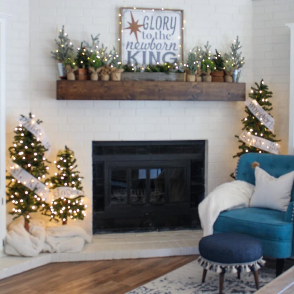 This mantel centers around a “Glory to the Newborn King” sign with multiple small potted Christmas trees arranged along a wooden mantel shelf. String lights throughout create a warm glow, emphasizing the spiritual aspect of the holiday while maintaining a clean, organized aesthetic.