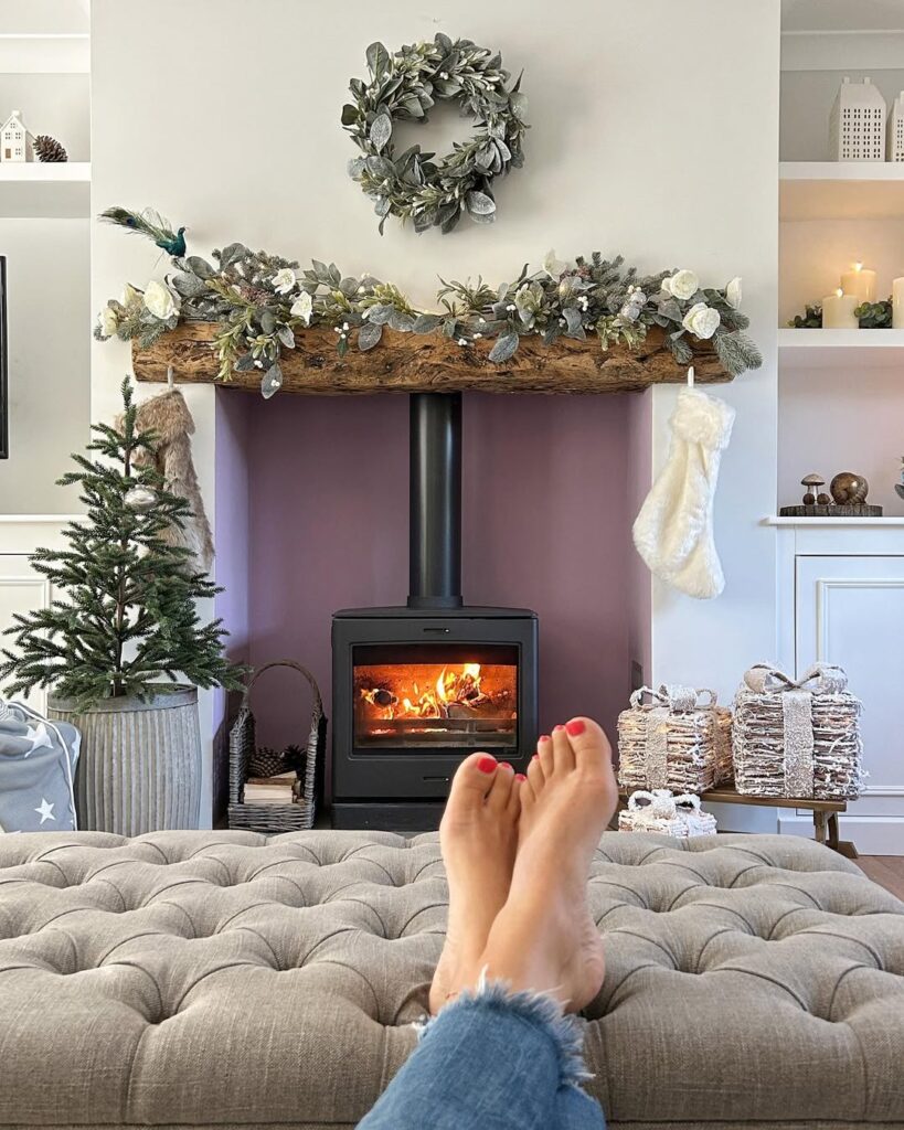 Featuring a corner wood stove setup, this space uses knit stockings and natural garland to create a cabin-like atmosphere. A decorated Christmas tree nearby complements the warm, lived-in feeling enhanced by books and comfortable seating areas.
