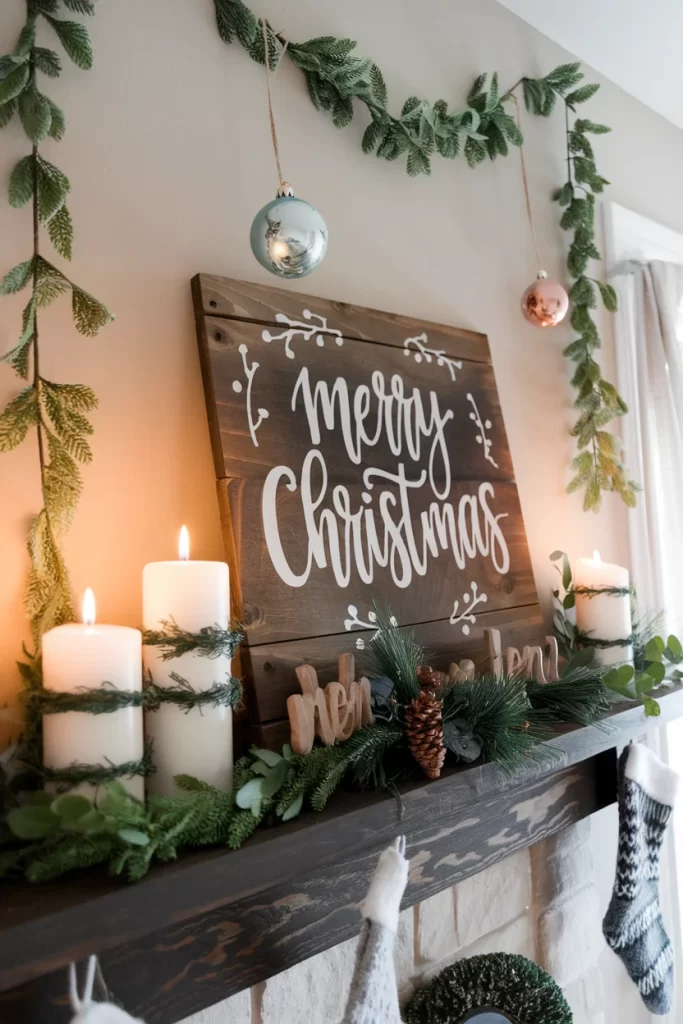 A stunning “Merry Christmas” wooden sign serves as the focal point, complemented by cascading evergreen garland from above. White pillar candles wrapped with greenery create ambient lighting, while metallic ornaments in blue and copper tones add sparkle. The natural wood elements give this display a cozy farmhouse feel.