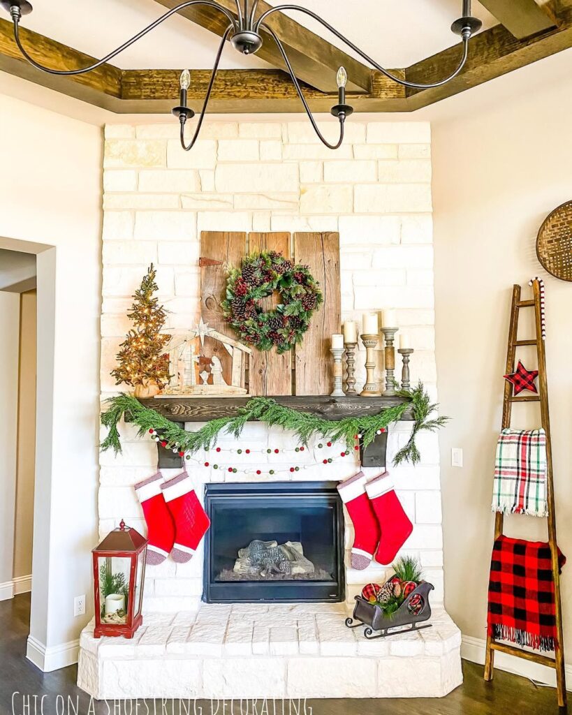This display showcases exposed wood beams and white stone with a natural wreath mounted on reclaimed wood. Red stockings hang from the mantel adorned with evergreen garland and red berry accents. Vintage-style candlesticks in mixed heights create visual interest, while a wooden ladder displays plaid throws as a side accent.