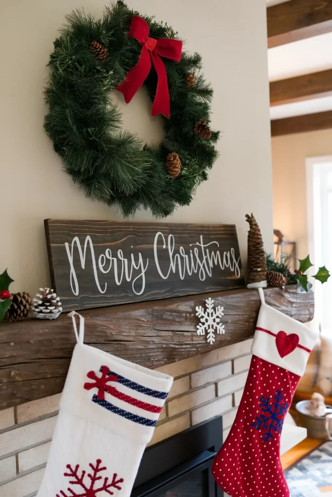 A full, natural evergreen wreath with red velvet bow creates an understated but elegant focal point. The “Merry Christmas” wooden sign below, along with scattered pinecones and patriotic-themed stockings, keeps the decoration simple yet festive.
