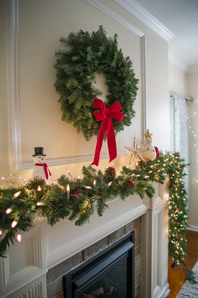 Image shows a classic approach with a full evergreen wreath adorned with a simple red bow, complemented by matching evergreen garland along the white mantel. A small snowman figure and warm string lights create a cozy, traditional Christmas atmosphere.