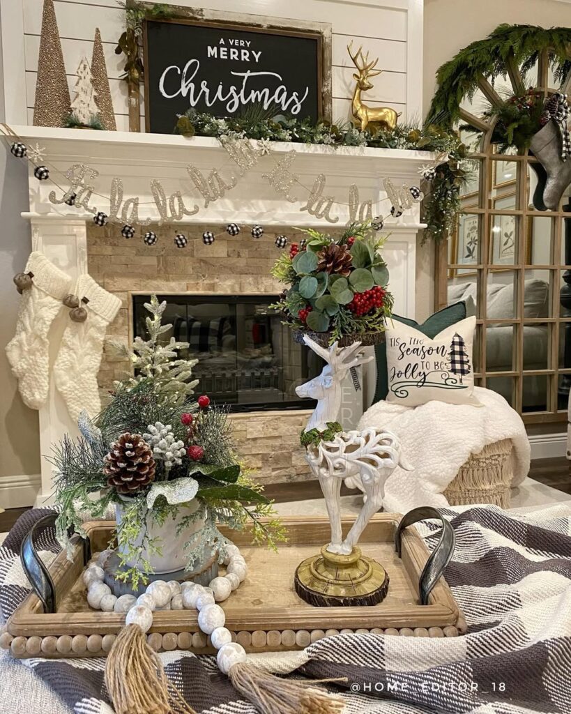 A brick fireplace mantel decorated with buffalo plaid ribbons and rustic elements creates a cabin-like Christmas feel. The antler decoration and traditional Santa figure emphasize the lodge theme, while the red plaid patterns tie everything together. This approach works well for those who prefer a more masculine or rustic holiday aesthetic.